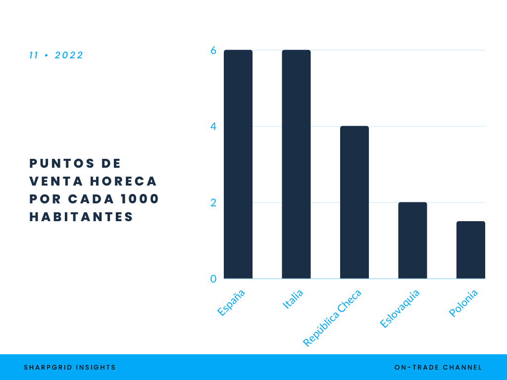 Mientras que Chequia, España e Italia se encuentran más o menos en la misma línea, Polonia y Eslovaquia destacan en los extremos opuestos del gráfico, lo que podría parecer extraño a primera vista, dado que sus proporciones de locales per cápita son muy similar, como se aprecia a continuación: