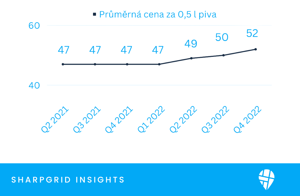 Vzrostla ovšem taky konečná cena pro spotřebitele. V roce 2021 byla v průměru na celou zemi 47 Kč za půllitr piva, v roce 2022 už 52 Kč, což je meziroční nárůst o téměř 11 %. Zatímco během roku 2021 ceny stagnovaly, hned od druhého kvartálu 2022 začaly růst.