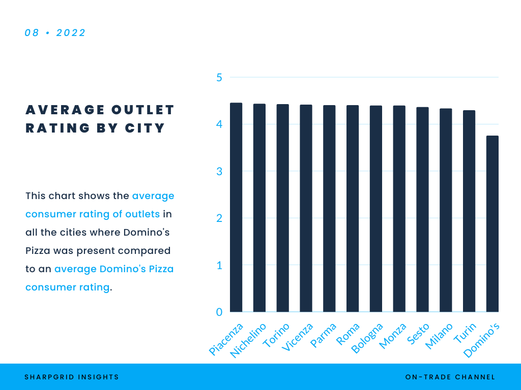 In terms of quality (customer rating), Domino’s outlets have pretty dismal numbers in Italy. Just compare the average customer ratings and see for yourself: