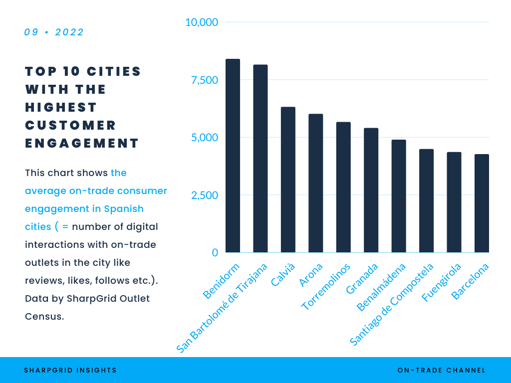 When looking at the customer engagement with on-trade outlets (measured by the amount of digital engagement like leaving reviews, commenting, rating, etc.), the top cities are Benidorm, San Bartolomé de Tirajana and Calvià, making them (potentially) ideal places for showcasing products, test portfolio innovations etc. The “Top 5 engaged cities” all have a population under 100 000, further strengthening the hypothesis about the decentralized and fragmented nature of Spanish on-trade.