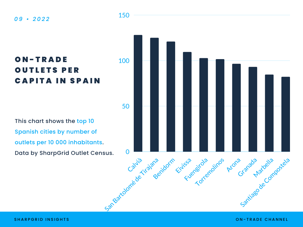 Most of the on-trade heavy cities are located either close to the coast or on the island regions. Just take the winner Calvià with 128 outlets per 10 000 people, for example. It’s a rather small city with around 50 000 inhabitants, but has over 20 beaches and is visited by over 1.6 million tourists every year, so the on-trade is naturally very strong here.
