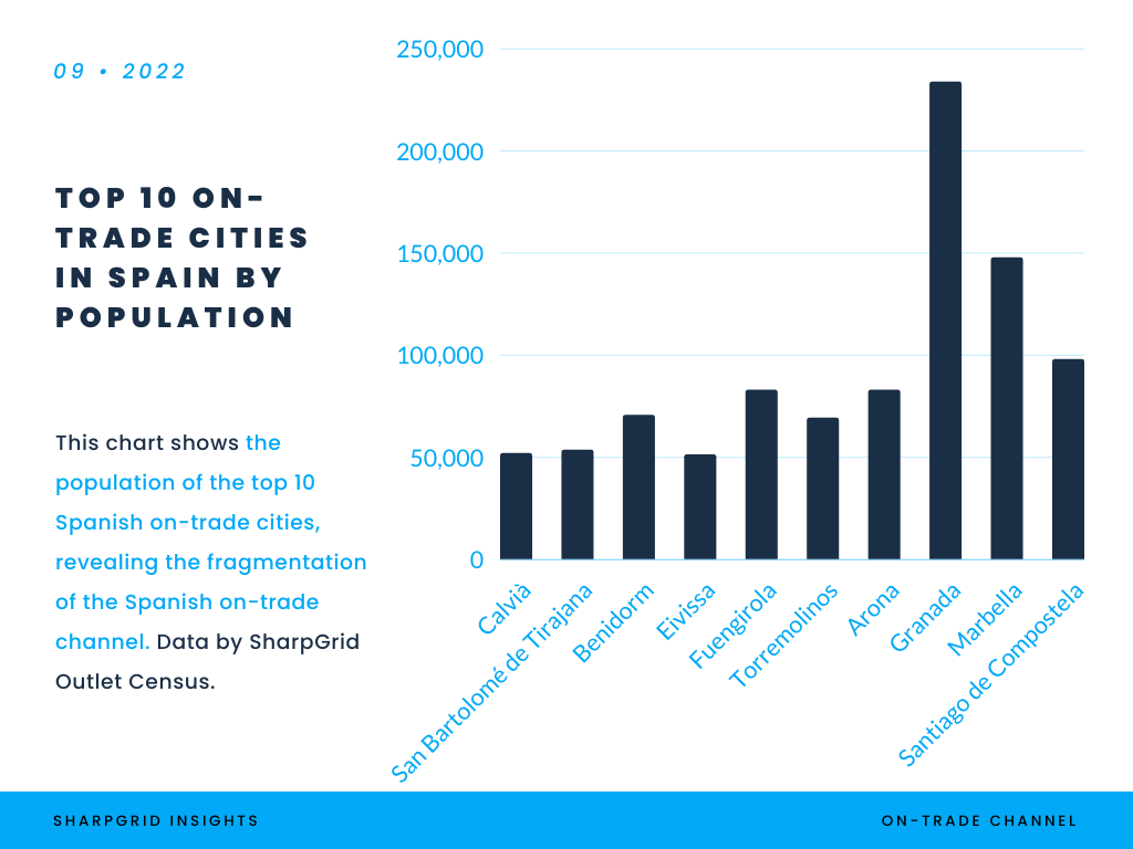 As you can see, the cities with the highest on-trade concentration are no metropolises. In fact, most of them have population under 100 000 people. The biggest one is Granada with a population just over 200 000.