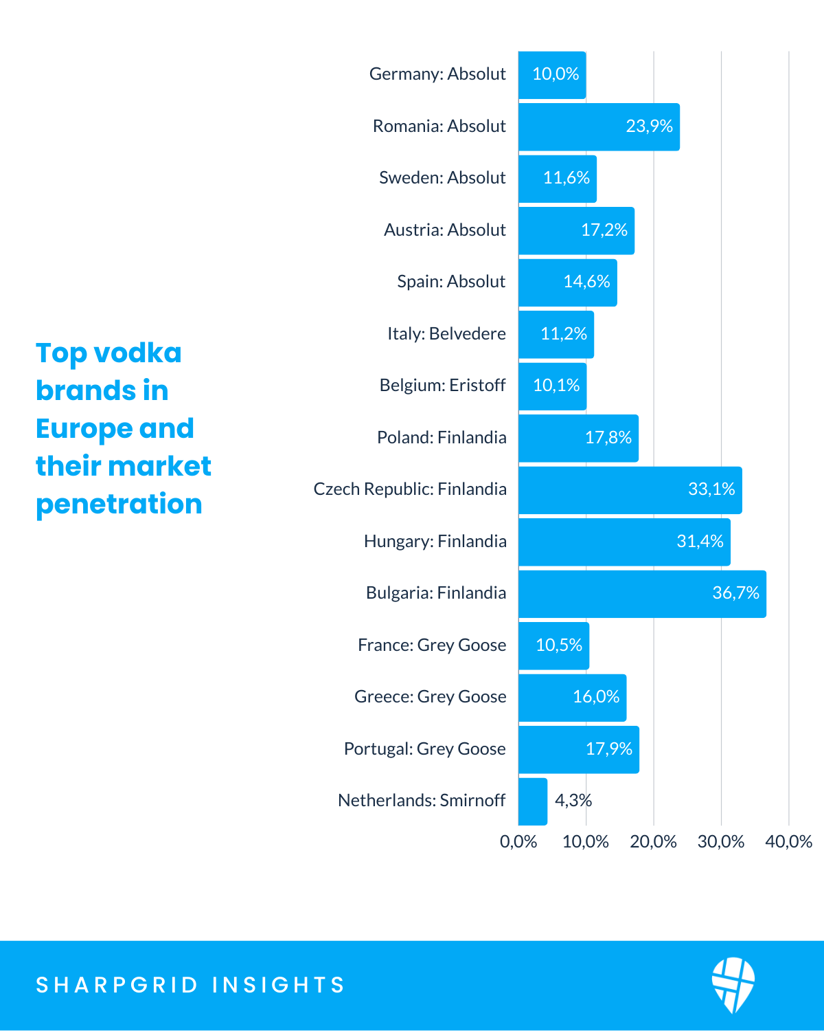 Whatever happens, vodka is here to stay. It is loved for its versatility and ability to be mixed in just about anything. Sharpgrid’s data highlights a fascinating trend: three brands (Absolut, Grey Goose, and Finlandia) dominate vodka menu penetration across the continent. Let's dive into their stories.
