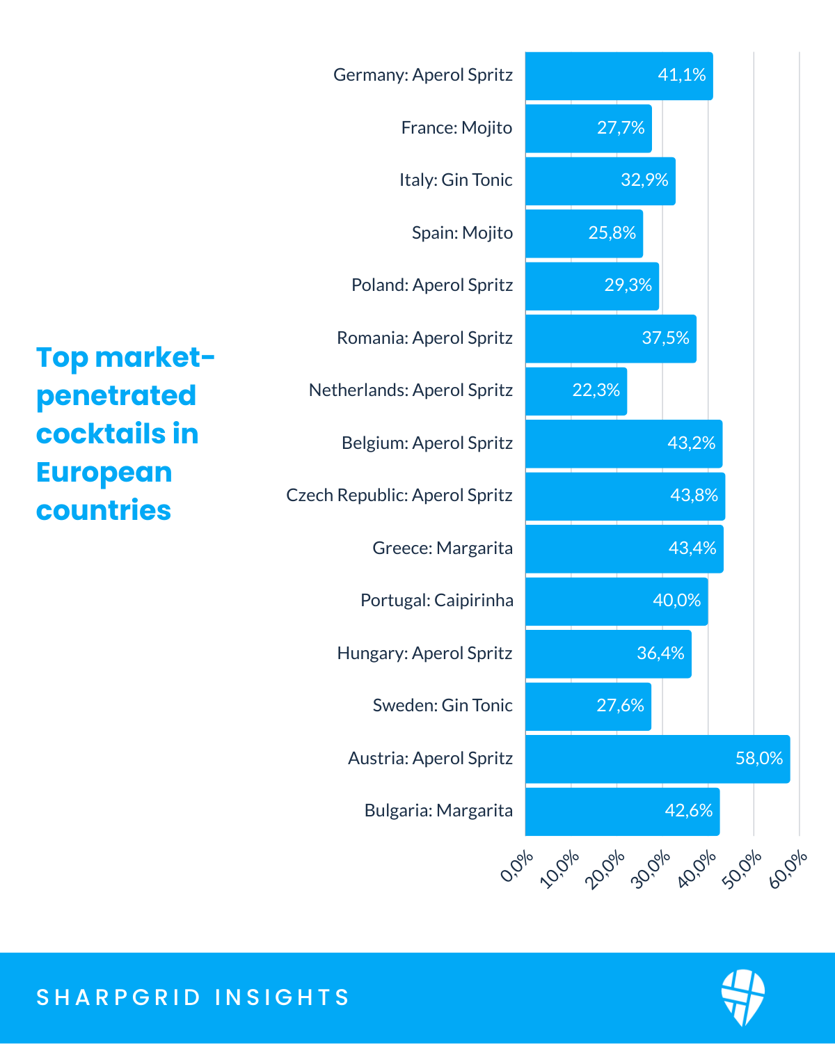 In Austria, the Aperol Spritz leads with an astonishing 58% penetration, making it the highest across all surveyed cocktails in Europe. This overwhelming popularity likely stems from Austria’s proximity to Italy and the influence of the Spritz culture in Alpine leisure and tourism.